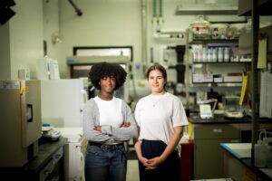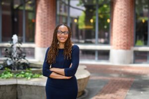 One of these students is Tarah Paul, a third-year graphic design major in the College who considers Makuu a second home. Paul was involved in the creation of the mural, lending her graphic design skills and overall creative direction to the project. Other key collaborators were Monolith, the student group that works to showcase and uplift Black visual art, and staff members from Makuu and University Life, including Marjan Gartland, director of creative strategy and design. “The people in this mural were mountain climbers in a sense, which is why we used design elements to visually represent mountains and clouds,” says Paul. “I’m looking at this mural with a sense of guilt because I don’t recognize some of the names. It makes me wonder what other names I don’t know.”